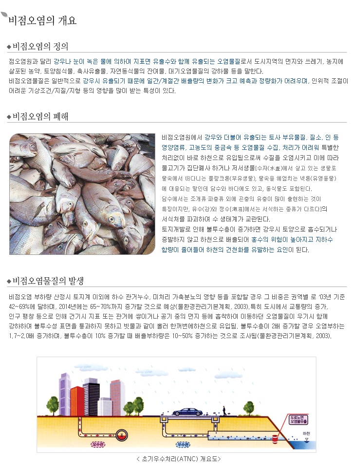 | 도시지역 | 도로 및 교량건설, 토지형질변경, 우수관거, 합류식관거, 지표면 유출수, 도로유출수 등 |